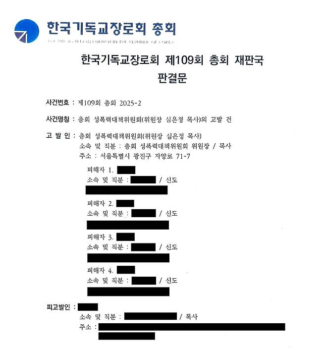 한국기독교장로회 제109회 총회 재판국은 5월 13일 판결을 통해 "A 씨의 성범죄 혐의는 교단 헌법을 명백히 위반한 중대한 범죄로, 교회의 신성과 질서를 심각히 훼손했다"고 밝혔다.