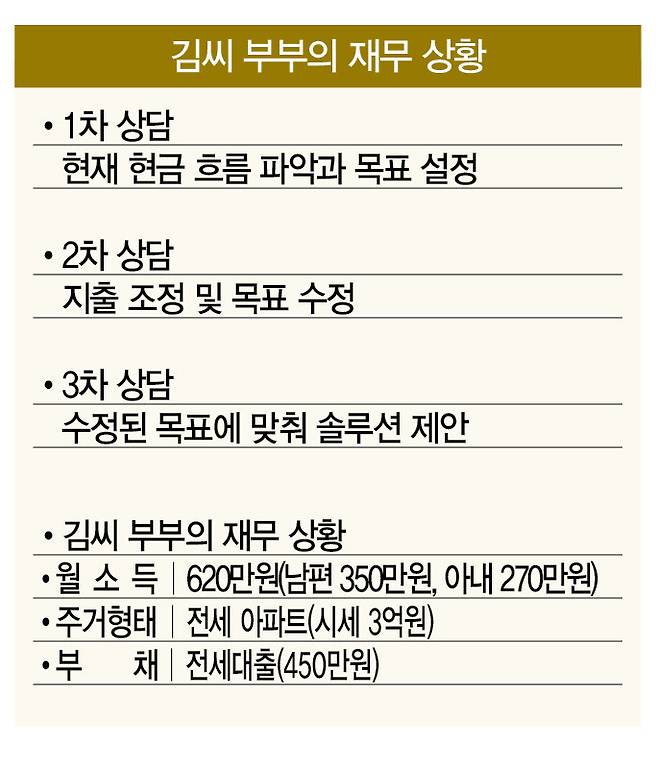 물론 긍정적인 부분이 없는 건 아니다. 부부는 이미 3억원 상당의 전세 아파트에 살면서 전세 대출금(450만원)을 대부분 상환했다. 부부가 자발적으로 재테크를 공부하면서 내집 마련의 꿈을 키워온 것도 높이 살 만하다.