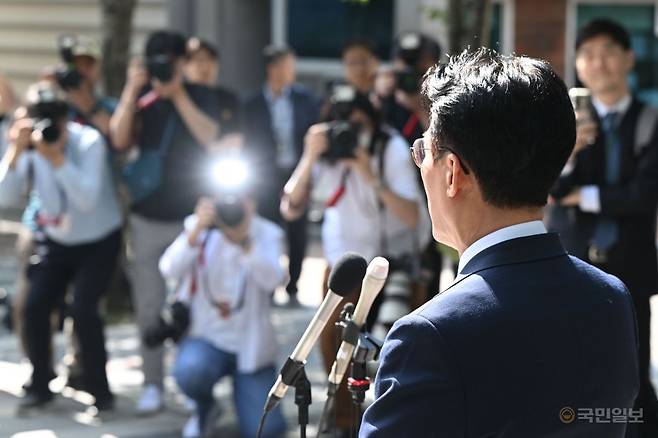 김민석 국무총리 후보자가 5일 서울 종로구 금융감독원 연수원에서 인사청문회 준비 사무실에 출근하며 기자회견하고 있다.
