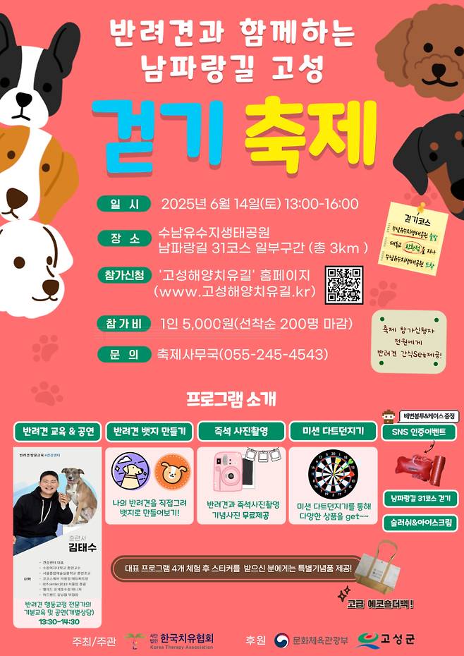 고성군은 6월14일 수남유수지 생태공원과 대독누리길 일원에서 ‘반려견과 함께하는 남파랑길 고성 걷기축제’를 개최한다.