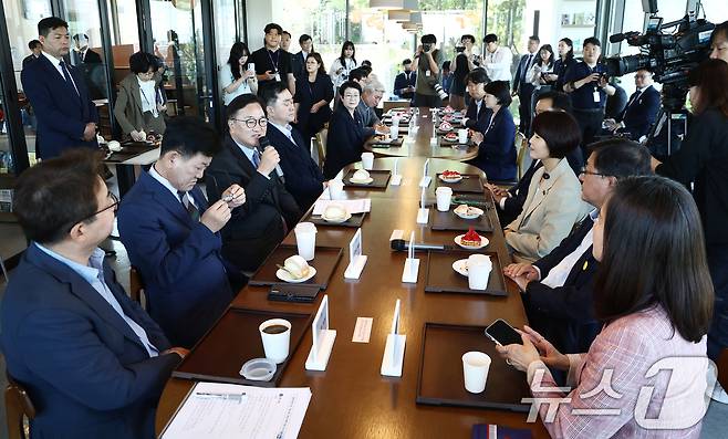 (서울=뉴스1) 김민지 기자 = 우원식 국회의장이 5일 서울 여의도 국회 강변서재에서 열린 '세계 환경의 날 기념 국회 기후위기특위 초청 차담회'에서 인사말을 하고 있다. 2025.6.5/뉴스1
