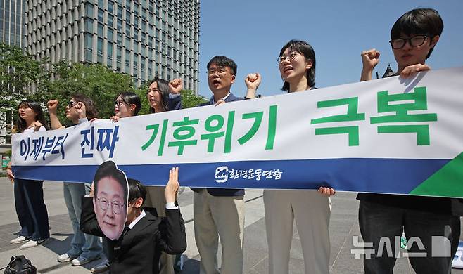 [서울=뉴시스] 김금보 기자 = 환경운동연합 활동가들이 5일 오전 서울 종로구 광화문광장에서 이재명 정부의 탈플라스틱, 생물다양성 회복 등 기후위기 극복을 위한 정책 시행을 제안하는 기자회견을 열고 퍼포먼스를 하고 있다. 2025.06.05. kgb@newsis.com