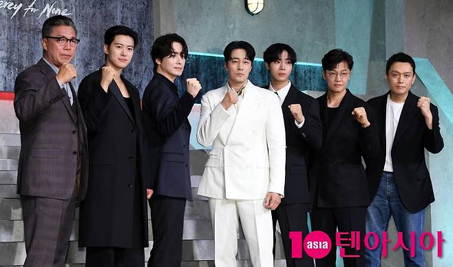 [텐아시아=조준원 기자]최성은 감독, 소지섭, 공명, 추영우, 안길강, 조한철, 이준혁이 5일 서울 중구 앰배서더 서울 풀만 호텔에서 열린 넷플릭스 시리즈 <광장> 제작발표회에 참석해 포즈를 취하고 있다.