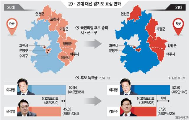 21대 대통령 선거에서 이재명 대통령이 승리한 데에는 그의 정치적 고향인 경기의 표심이 주효했다는 분석이다. 특히 지난 20대 대선과 비교했을 때 경기 지역의 표심에 눈에 띄는 변화가 있는 것으로 나타났다.