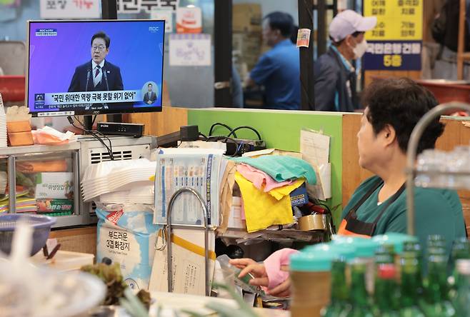 | ▲ 4일 서울 서대문구 인왕시장에서 한 가게의 TV 화면에 이재명 대통령 취임선서 행사가 생중계로 방송되고 있다. |