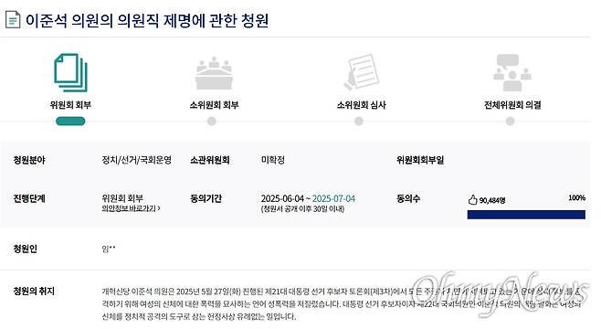 지난 4일 오후 2시 40분 국회 국민동의청원 게시판에는 '이준석 의원의 의원직 제명에 관한 청원'이 올라왔다. 청원인에 따르면, 같은 날 오후 7시 30분께 동의 인원 5만 명을 달성했다. 5일 오전 11시 30분 기준 약 9만 1000명이 청원에 동참했다.