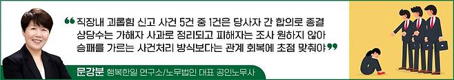 실태조사에서 주목할 부분은 신고된 사건의 21.3%가 당사자 간 합의로 종결되었다는 점이다. 이 중 83.3%는 가해자의 사과를 통해 원만히 정리되었고, 피해자 중 44.4%는 조사를 원하지 않았으며, 27.8%는 단순 보호조치만을 요청한 상황에서 정식 조사 없이 사건을 종결한 것으로 조사되었다. 당사자 간 직장 내 갈등을 해소하고 상호 존중하는 일터를 만들기 위해서는 비공식적 절차를 다양하게 설계하고, 그 활용이 실제로 현실화될 수 있도록 촉진할 필요가 있다는 얘기다.