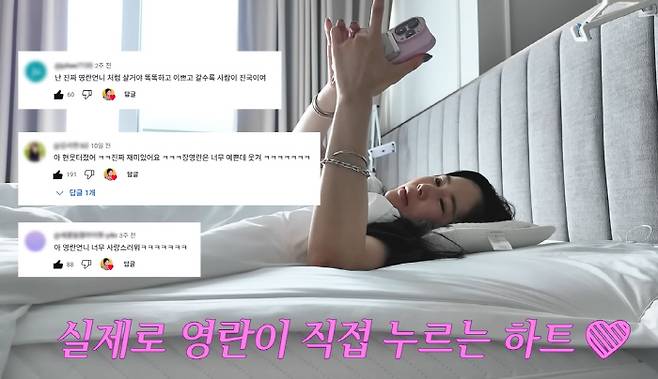 장영란은 "제가 말 하는 걸 좋아하지만 오늘은 말을 아끼겠다. 전화도 안왔으면 좋겠다"라며 "이 시간에 이렇게 누워있다고? 밥도 몇 시에 먹든 상관 없잖아. 내 마음대로 하면 되잖아"라고 행복해 했다.