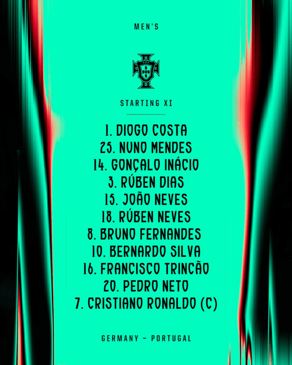 포르투갈의 로베르토 마르티네스 감독은 4-3-3 포메이션을 꺼내 들었다. 골문은 디오구 코스타가 지켰고, 수비진은 누누 멘데스-곤살루 이나시우-후벵 디아스-주앙 네베스로 구성됐다. 중원은 브루노 페르난데스, 후벵 네베스, 베르나르두 실바가 맡았고, 공격진에는 페드루 네투, 호날두, 프란시스쿠 트린캉이 나섰다.