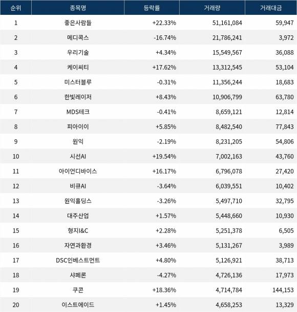 주목할 만한 종목으로는 거래량 1위인 좋은사람들과 거래량 19위인 쿠콘이다.