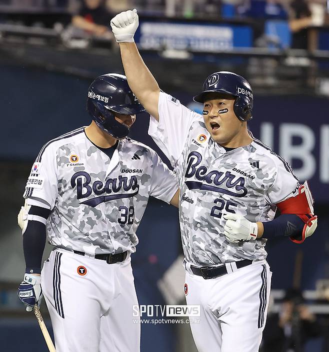 5회말 2사에서 KIA 선발 네일을 상대로 동점 솔로포를 날린 베테랑 양의지도 팀의 사기를 끌어올리기 위해 한 손을 번쩍 들어올리며 기쁨의 포효를 했다.