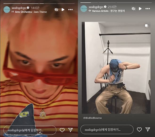 지드래곤은 4일 자신의 계정에 별다른 멘트 없이 짧은 영상을 게재했다. 공개된 영상에서 지드래곤은 의자에 앉아 하늘색 미키 티셔츠를 입으려 애쓰는 모습이다. 평소 여성복을 입을 정도로 슬림한 몸매의 소유자인 지드래곤은 의외로 단단한 팔근육을 드러내 눈길을 끌었다.