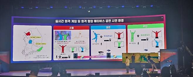 우선 방 원장은 서울과 대전, 부산 왕복 1천190㎞를 6.2㎳ 지연으로 연결하는 6G 기술을 통해 실시간 가위바위보 게임을 시연했습니다. 서울과 대전, 부산에서 끊김없이 차례대로 1부터 9까지 숫자를 세거나, 메타버스 속에서 실시간으로 크라잉넛의 '밤이 깊었네'를 동시에 함께 부르는 공연 등을 선보이기도 했습니다.