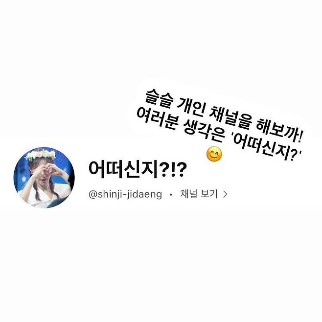 신지는 지난 4일 개인 계정을 통해 “슬슬 개인 채널을 해볼까. 여러분 생각은 ‘어떠신지?’”라는 글과 함께 한 장의 사진을 공개했다. 사진에는 '어떠신지?!?'라는 제목의 채널 화면이 담겨 채널 개설 준비 중인 신지의 근황이 엿보였다.
