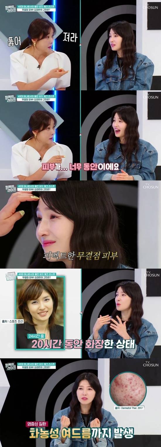 김경란은 "사실 이런 이야기를 들으면 약간 인생 드라마 같다. 제가 피부가 인생 최대 고민이었다. 2001년 KBS 공채 아나운서가 된 후에 뉴스만 하는 것이 아니라 뉴스가 끝나면 다른 방송도 녹화하면서 24시간 중에 20시간을 화장을 한 채로 있었다"고 말했다.