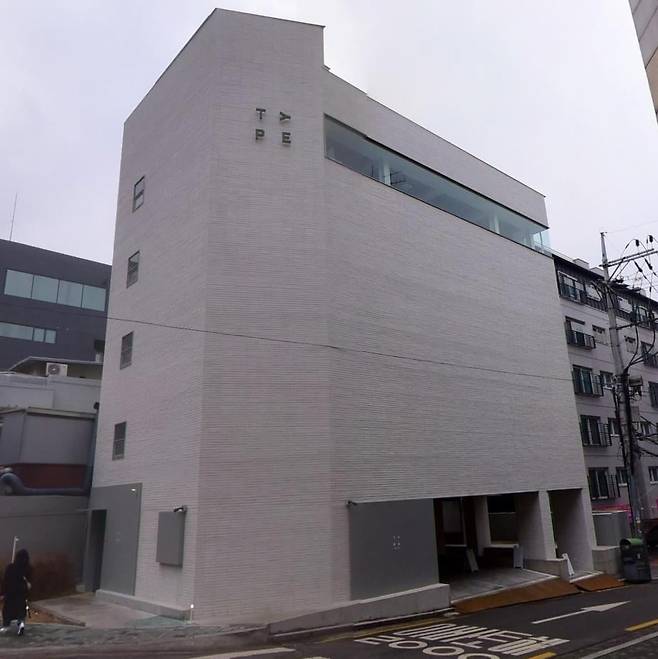 기존의 과도한 색상 띠나 패턴은 모두 제거하여 단일 색조의 간결함과 입면의 정돈된 느낌을 강조했습니다. 특히 전면부 창호는 과거의 불균형한 작은 창 대신, 가로로 긴 슬릿형 유리창을 적용하여 채광과 개방감을 확보하는 동시에 건물에 수평적 리듬감을 부여했습니다. 코너에 설치된 간결한 영문 레터링 간판(TAPE)은 브랜드 정체성을 표현하면서 건축물 자체가 하나의 간판 역할을 하도록 디자인된 점이 인상적입니다.