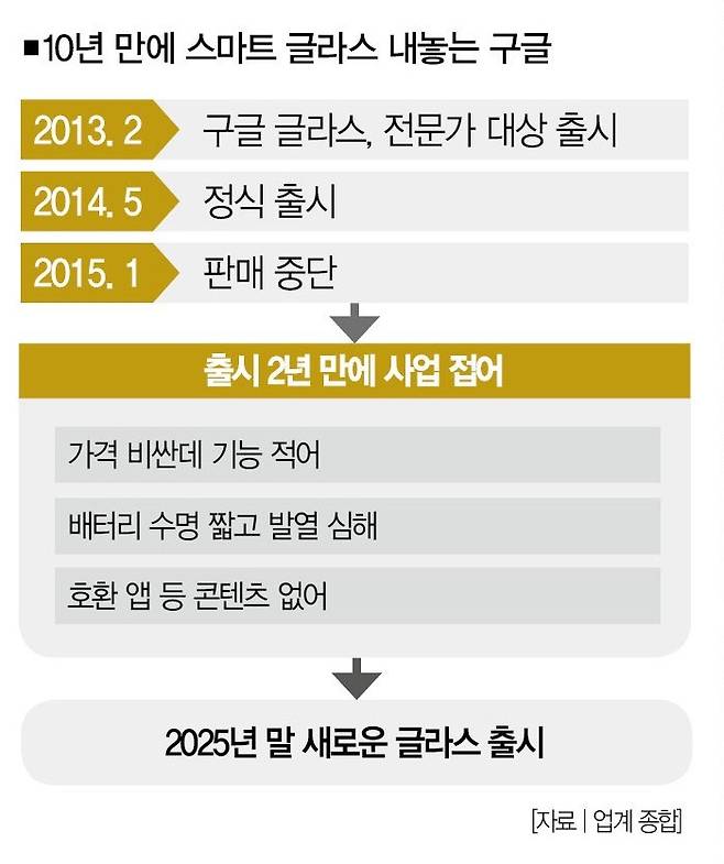 구글이 '스마트 글라스'를 다시 출시한다. 2015년 기능적 한계를 극복하지 못한 채 사업을 잡은 지 10년 만이다. 이번엔 뭔가 좀 다르다. 인공지능(AI)를 적용해 기술을 끌어올렸다. 그렇다고 안심할 상황은 아니다. XR 시장의 절대강자 메타 역시 기술적 진화를 거듭하고 있어서다. 스마트폰을 두고 굳이 스마트 글라스를 선택할 소비자가 얼마나 있을지도 의문이다.