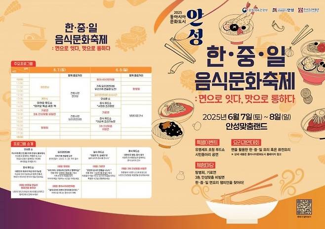안성시는 시는 7~8일 이틀간 안성맞춤랜드에서 '2025 한·중·일 음식문화축제'를 개최한다고 5일 밝혔다.