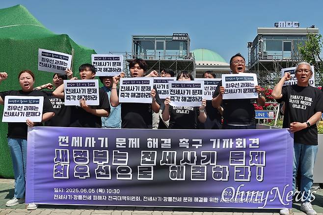 | ▲ 전세사기·깡통전세 피해자 전국대책위원회, 시민사회대책위원회가 5일 오전 10시 30분 국회 정문 앞에서 새로 출범한 이재명 정부에 정책요구안을 전달하고 면담을 요청하는 기자회견을 열었다. |