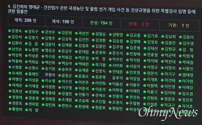 | ▲ 김건희 특검법, 누가 찬성하고 반대했나 김건희 특검법 표결 결과가 5일 오후 국회 본회의장 전광판에 표시돼 있다. 김건희 특검법은 재석 의원 198인 중 찬성 194인, 반대 3인, 기권 1인으로 가결됐다. 표결에 참여해 찬성표를 던진 의원은 녹색, 반대표를 던진 의원은 붉은색, 기권한 의원은 노란색 동그라미가 이름 옆에 표시돼 있다. 표결에 불참한 의원의 이름은 흰색으로 표시돼 있다. 김건희 특검법은 김 여사의 명품 가방 수수와 건진법사 관련 의혹, 정치 브로커 명태균씨가 연루된 공천 개입·불법 여론조사 의혹 등을 다룬다. |