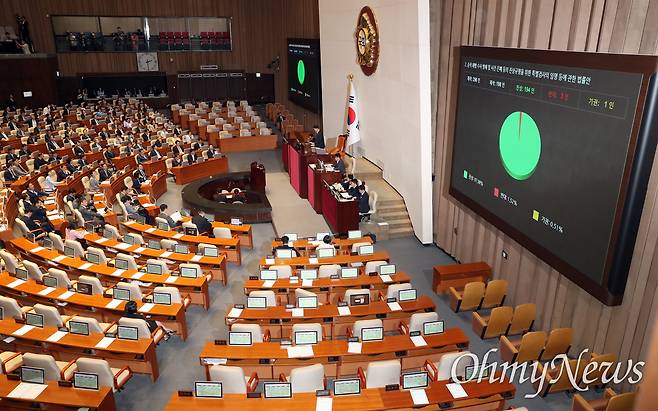 | ▲ 채상병 특검법이 5일 국회에서 열린 본회의에서 통과되고 있다. |