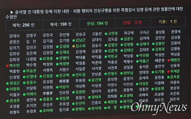 | ▲ 내란 특검법, 누가 찬성? 누가 반대? 내란 특검법 수정안 표결 결과가 5일 오후 국회 본회의장 전광판에 표시돼 있다. 내란 특검법 수정안은 재석 의원 198인 중 찬성 194인, 반대 3인, 기권 1인으로 가결됐다. 표결에 참여해 찬성표를 던진 의원은 녹색, 반대표를 던진 의원은 붉은색, 기권한 의원은 노란색 동그라미가 이름 옆에 표시돼 있다. 표결에 불참한 의원의 이름은 흰색으로 표시돼 있다. 내란 특검법 수사 대상은 윤석열 전 대통령의 12·3 불법계엄 선포와 관련된 범죄 의혹 11가지로 늘어났다. |