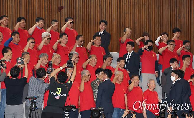 5일 오후 국회 본회의장. 우원식 국회의장의 말이 끝나자 국회 본회의장 참관석에 앉아 있던 빨간 옷의 해병대예비역연대 50여명이 자리에서 일어섰다. 그들은 한동안 오른손을 올려 '경례' 자세를 유지했다. 두 주먹을 불끈 쥐어들기도, 감격스러운 표정을 지어보이기도 했다.