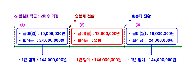 ② 연봉제로 전환하는 경우 퇴직금을 연봉에 포함하여 지급하는 방식이기 때문에 1년 퇴직금(24,000,000원) + 1년 지급 금액 총액(120,000,000원)을 합산하면 144,000,000원이 되어, 매월 12,000,000원이 됩니다. 즉, 호봉제 급여보다 2,000,000원이 증가하였습니다. 왜냐하면, 퇴직금을 포함하여 지급하였기 때문입니다.