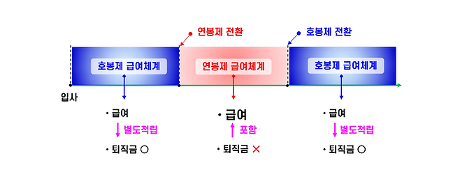 즉, 호봉제로 전환했다는 것은 연봉제에서 받는 급여에서 퇴직금 적립 금액만큼 줄어든 급여를 받아야 한다는 것입니다. 이해를 돕기 위해 실제 급여 지급 금액을 예시로 설명 드립니다.
