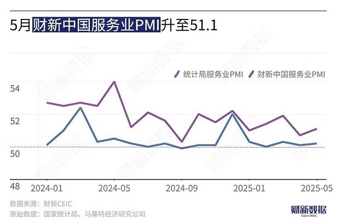 5일 차이신과 로이터통신에 따르면 5월 서비스업 PMI는 전월(50.7)보다 0.4포인트 올라간 51.1로 집계됐는데, 시장 전망치(51.0)를 약간 웃돌았습니다.