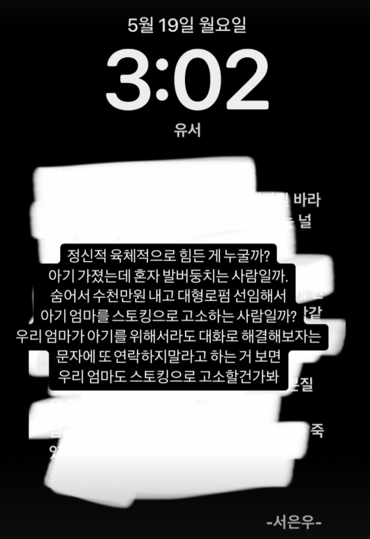 서민재의 근황에 눈길이 쏠린 것은 그가 지난달 19일 SNS에 ‘유서’라는 제목으로 “신적 육체적으로 힘든 게 누굴까? 아기 가졌는데 혼자 발버둥치는 사람일까. 숨어서 수천만원 내고 대형로펌 선임해서 아기 엄마를 스토킹으로 고소하는 사람일까? 우리 엄마가 아기를 위해서라도 대화로 해결해보자는 문자에 또 연락하지 말라고 하는 거 보면 우리 엄마도 스토킹으로 고소할건가봐"라고 글을 올린 뒤 보름 가까이 SNS 활동을 멈춰기 때문.