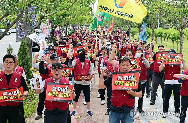(광주=연합뉴스) 조남수 기자 = 광주 시내버스 노조 전면파업 첫날인 5일 광주광역시청 앞에서 열린 총파업 투쟁 승리쟁취 버스노동자 결의대회에서 참석자들이 구호를 외치고 있다. 2025.6.5