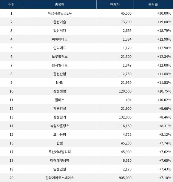 6위 노루홀딩스(000320)는 종가 21,300원으로 12.34% 상승 마감했다. 7위 형지엘리트(093240)는 종가 1,847원으로 12.08% 상승 마감했다. 8위 한전산업(130660)은 종가 12,750원으로 11.84% 상승 마감했다. 9위 NHN(181710)은 종가 21,950원으로 11.53% 상승 마감했다. 10위 삼성생명(032830)은 종가 120,500원으로 10.75% 상승 마감했다.