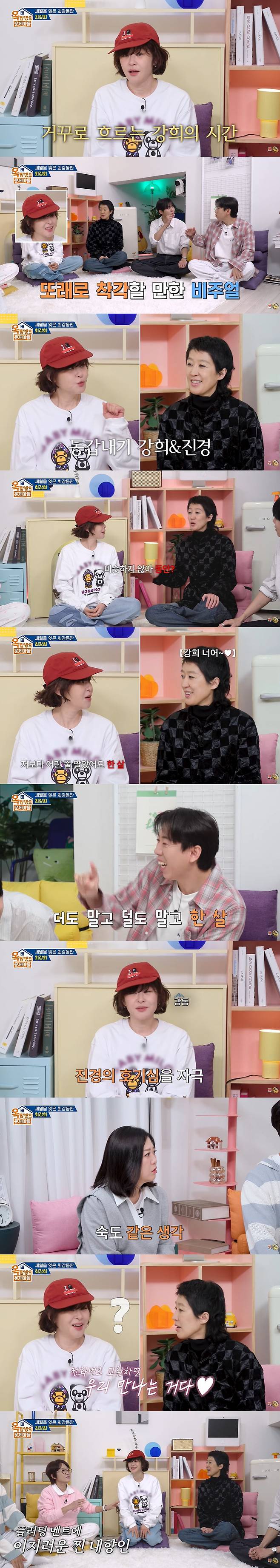 이에 홍진경은 "나 늙었냐"며 서운한 표정을 지었고, 최강희는 "나보다 한 살 어린 줄 알았다"고 했다.