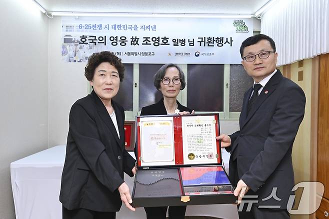 (서울=뉴스1) = 이근원 국방부유해발굴감식단장과 고 조영호 일병의 유가족(왼쪽부터 작은 딸 조한금, 큰딸 조한춘)이 '호국의 얼' 함을 들고 기념사진을 촬영하고 있다. (국방부 제공. 재판매 및 DB 금지) 2025.6.5/뉴스1
