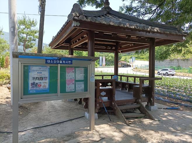 | ▲ 대소강마을 입구에서 바로 마주할 수 있는 정자. 사진을 보면, 계단 첫 번째 나무가 파손됐음을 볼 수 있다. |
