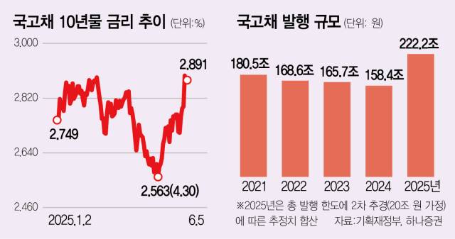 이로써 올 국고채 발행 규모는 200조 원을 훌쩍 넘길 것으로 보인다. 국고채 발행 규모는 코로나19 시기였던 2020년(174조 5000억 원)과 2021년(180조 5000억 원) 급증한 뒤 2022~2024년 완만하게 감소해왔다. 당초 올 국고채 총 발행한도는 197조 6000억 원이었으나 정부가 13조 8000억 원 규모의 1차 추경 중 68%인 9조 5000억 원을 국채 발행을 통해 조달하기로 하면서 지난달 초 207조 1000억 원으로 상향 조정됐다. 여기에 증권가에서 추정한 국고채 추가 조달 물량을 더하면 올 국고채 발행량은 사상 최대치인 222조 2000억 원에 달할 전망이다.