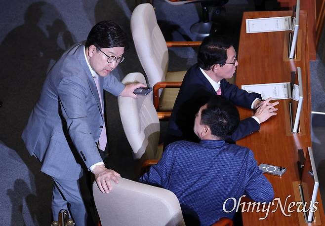 | ▲ 원내대표직 사퇴를 선언한 권성동 국민의힘 원내대표가 5일 국회에서 열린 본회의에서 김기현 의원과 대화하고 있다. |