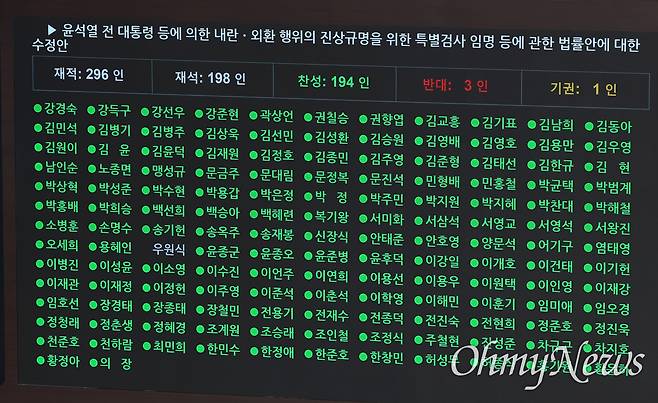 | ▲ 내란 특검법, 누가 찬성? 누가 반대? 내란 특검법 수정안 표결 결과가 5일 오후 국회 본회의장 전광판에 표시돼 있다. 내란 특검법 수정안은 재석 의원 198인 중 찬성 194인, 반대 3인, 기권 1인으로 가결됐다. 표결에 참여해 찬성표를 던진 의원은 녹색, 반대표를 던진 의원은 붉은색, 기권한 의원은 노란색 동그라미가 이름 옆에 표시돼 있다. 표결에 불참한 의원의 이름은 흰색으로 표시돼 있다. 내란 특검법 수사 대상은 윤석열 전 대통령의 12·3 불법계엄 선포와 관련된 범죄 의혹 11가지로 늘어났다. |