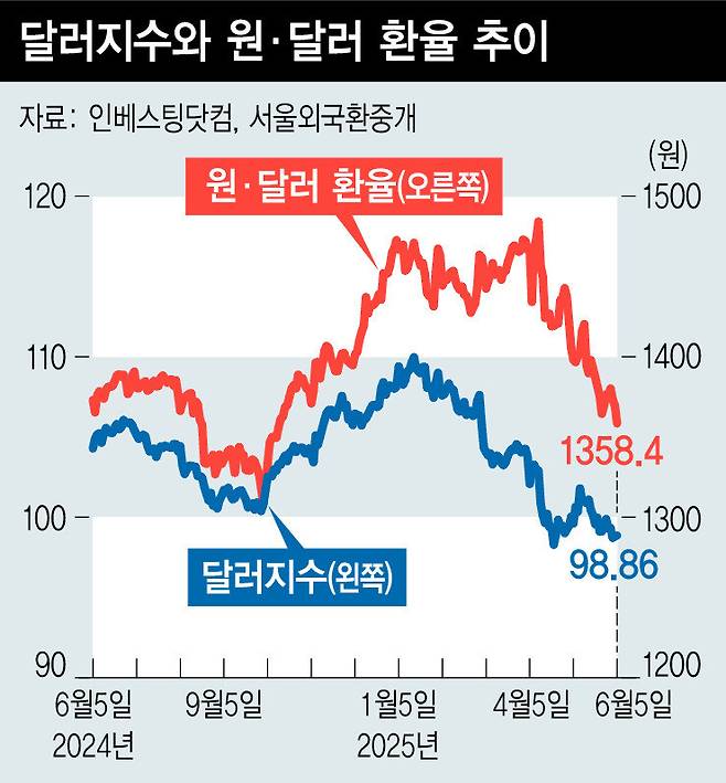 국제금융시장에서 미국 달러의 약세도 원화 강세를 뒷받침한다. 유로와 엔(일본), 파운드(영국) 등 주요 6개 통화에 견줘 미국 달러의 상대가치를 나타내는 달러지수는 4일(현지시각) 98.82(인베스팅닷컴 집계)에 마감했다.