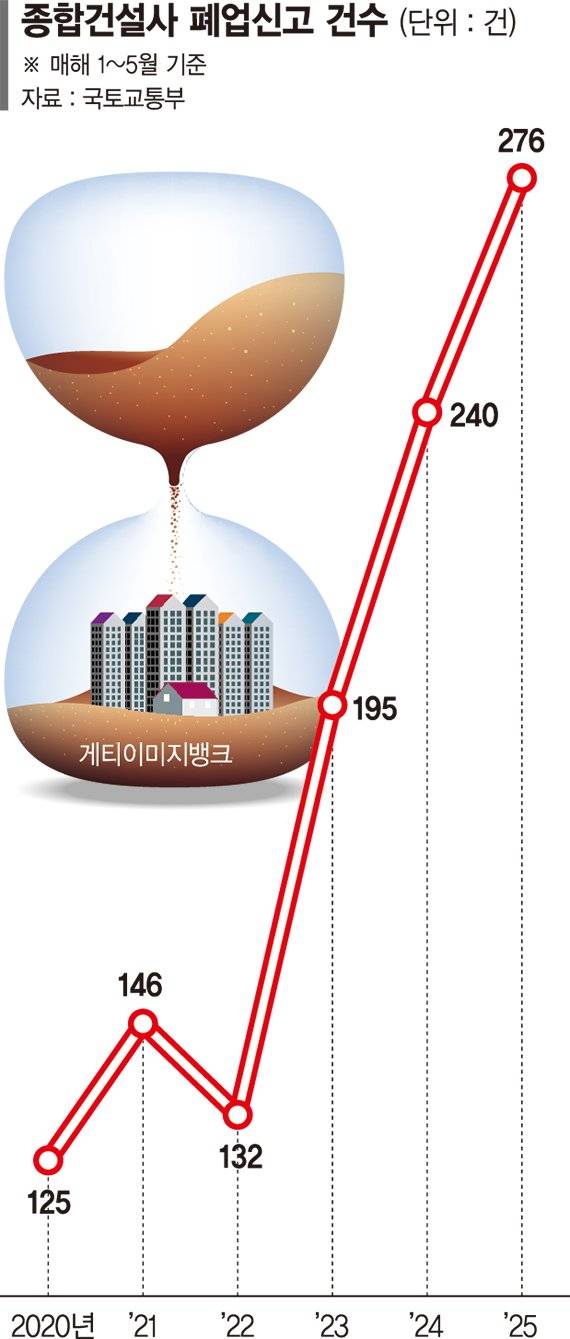 5일 국토교통부에 따르면 올 1~5월 종합건설사 폐업신고 건수는 276건으로 집계됐다. 지난해 같은 기간(240건) 대비 15% 증가한 수치다. 또 1~5월 폐업신고 기준으로 지난 2011년(268건) 이후 14년만에 최대치이기도 하다.