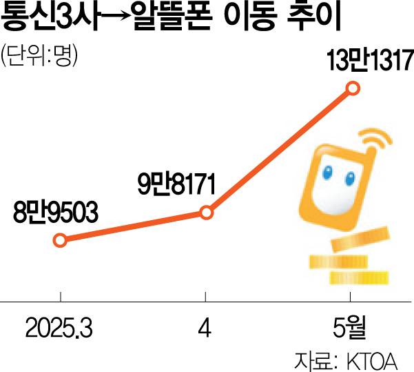 데이터 안심요금제 정책이 현실화하면 알뜰폰 가입 증가세가 더욱 가팔라질 것이라는 게 통신 업계의 중론이다. 이미 SK텔레콤 해킹 이후 소비자들이 알뜰폰으로 눈을 돌리는 상황에서 실질적인 혜택이 강화되기 때문이다. 한국통신사업자연합회(KT(030200)OA)에 따르면 지난달 SK텔레콤·KT·LG유플러스(032640) 등 통신 3사에서 알뜰폰으로 갈아탄 이동통신 이용자 수는 13만1317명으로 관련 통계 집계를 시작한 2012년 4월 이후 13년 만에 처음으로 13만명을 돌파했다. SK텔레콤 사고가 발생하기 전인 올해 3월만 해도 8만9503명에 불과했지만 두달 만에 47%가 늘어난 셈이다.