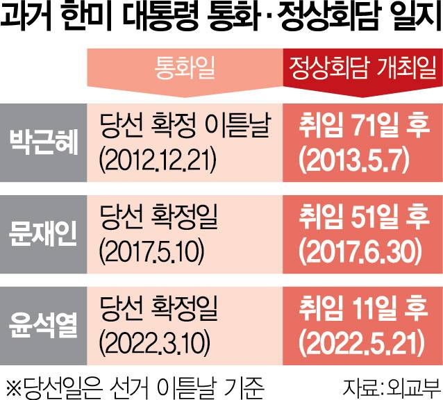 윤 전 대통령의 경우 취임 11일 만에 조 바이든 전 대통령이 방한해 한미정상회담(2022년 5월 21일)이 이뤄진 매우 이례적 사례다. 우리나라 역대 정부를 통틀어 출범 후 최단 기간 내 한미정상회담이 개최된 사례였고 미국 대통령이 방한해 정상회담을 가진 것도 1993년 7월 김영삼 전 대통령, 빌 클린턴 전 미국 대통령 이후 처음이었다.