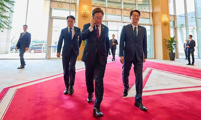 | 통화하며 출근 이재명 대통령이 5일 전화통화를 하며 서울 용산 대통령실로 출근하고 있다. 왼쪽은 황인권 대통령 경호처장, 오른쪽은 권혁기 전 더불어민주당 당대표 정무기획실장. 대통령실 제공 |