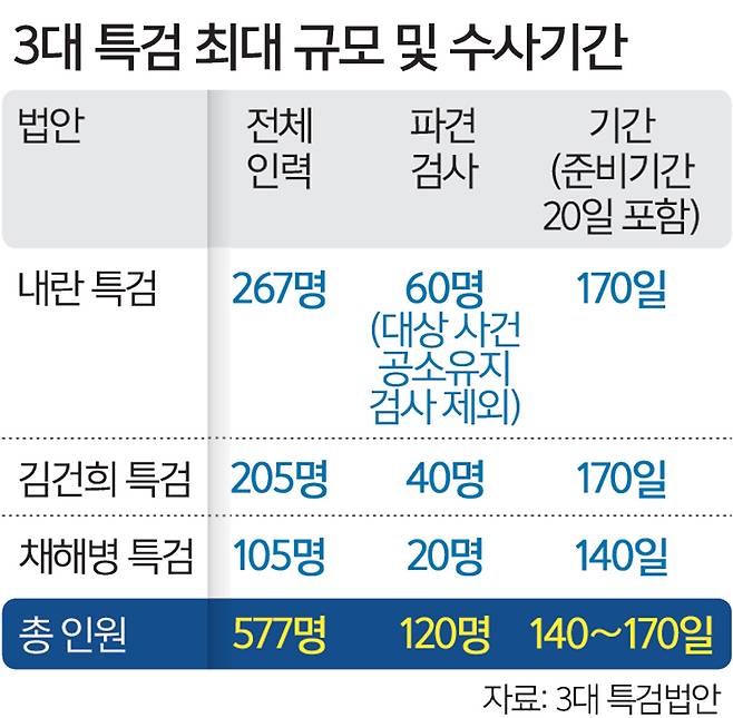더불어민주당 주도로 국회를 통과한 3대 특별검사법(내란 특검법·김건희 특검법·채해병 특검법)의 파견검사는 120명에 이른다.