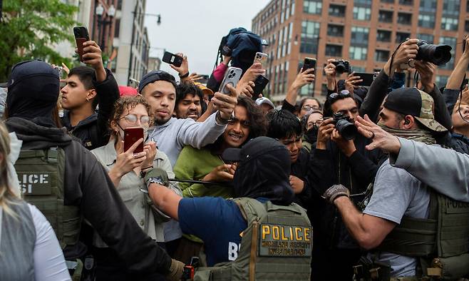 | 이민자 체포 반발하는 시위대 미국 일리노이주 시카고에서 4일(현지시간) 이민세관단속국(ICE) 직원들이 체류 사실 확인을 위한 정기적인 절차에 응한 이민자들을 체포하려다 이를 막으려는 시위대와 충돌하고 있다. 이민자 지원 단체들은 자진 신고한 사람들이 구금되고 있다고 주장했다. 시카고=로이터연합뉴스 |