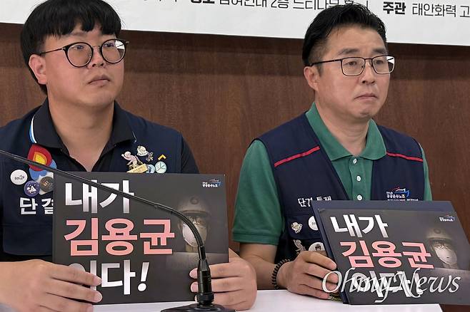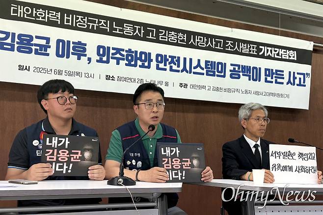 | ▲ 태안화력 고 김충현 비정규직 노동자 사망사고 대책위원회가 5일 오후 1시 참여연대 2층 아름드리홀에서 조사발표 기자회견을 열었다. 고인의 동료 노동자인 김영훈(공공운수노조 KPS비정규직지회장)·이태성(발전비정규직연대 집행위원장)씨가 기자회견에 참석해 "내가 김용균이다"라고 적힌 피켓을 들고 있다. |