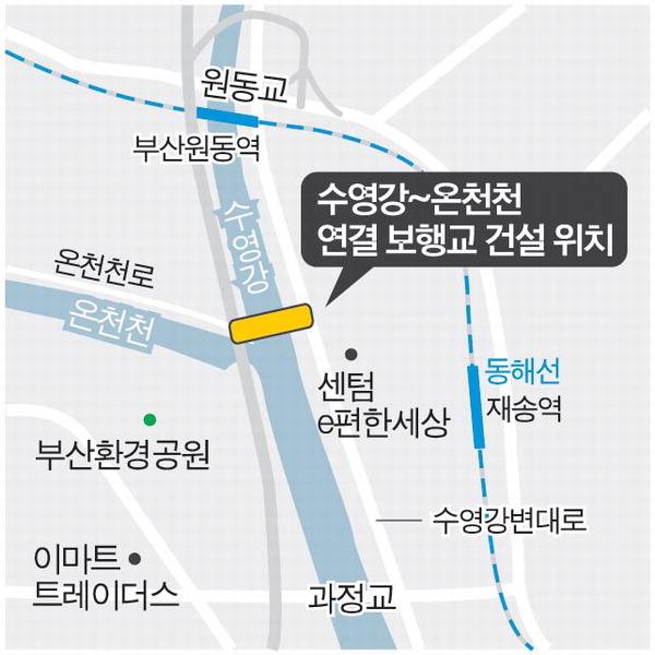 부산 해운대구가 수영강과 온천천을 잇는 보행자용 다리를 짓는 사업을 추진한다. 수영강을 안전하게 횡단할 수 있는 시설을 만들뿐만 아니라, 접근성 향상을 통해 인접 상권 활성화 등 지역경제 활성화 효과도 노린다.