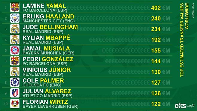 자말 무시알라(22·바이에른뮌헨/1억5480만유로), 페드리(22·바르셀로나/1억4370만유로), 비니시우스(24·레알마드리드/1억3040만유로), 콜 팔머(23·첼시/1억2650만유로), 훌리안 알바레스(25·아틀레티코마드리드/1억2600만유로), 플로리안 비르츠(22·레버쿠젠/1억2230만유로)가 나머지 TOP 10를 차지했다.