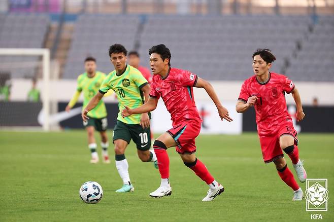 다만 한국은 지공 상황에서 호주의 압박을 풀어내는 것을 힘들어했다. 3선의 황도윤과 이승원이 상대 선수들에게 묶여 힘을 쓰지 못했고, 측면이나 최전방으로 향하는 긴 패스는 신장이 좋은 호주 선수들이 어렵지 않게 끊어냈다.